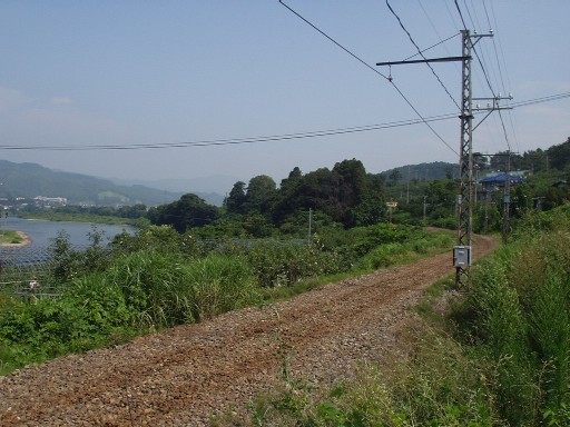 柳沢−赤岩間。梅雨の明けた空の下、架線柱の列は暑さに身じろぎもせずに南へと続いていた